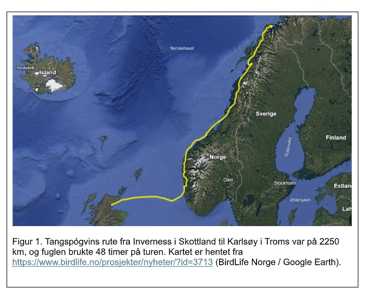 BirdLifeNorge hevur eina verkætlan har ein tangspógvi bleiv merktur í juli 2024 á búplássi í Karlsøy norðan fyri Troms (Falkenberg et al, 2025). Tangspógvin for á flog suðureftir á kvøldi 29. juli. Hann fleyg fram við norsku vesturstrondini, men steðgaði á fleiri ferðir. M.a. var hann heili 14 dagar á oynni Rørvik í norður Trøndelag. Eftir tað var hann 10 dagar sunnan fyri Smøla í Møre og Romsdal. Hagani fór hann til Sognefjorden og síðan út til havs vestur til Orkunoyggjar í Skotlandi har hann steðgaði í 3 tímar. Eftir tað fleyg hann til eitt øki norðan fyri Inverness, har hann var allan veturin í einum lítlum øki. Hann byrjaði ferð sína norður aftur 13. apríl. Hann fór fram við strondini í Landnyrðingsskotlandi og mest sum beint eystur oynna Utsira í Noreg. Á ferðini norður til búplássið á Karlsøy steðgaði hann bert tríggjar ferðir og hvíldi seg í 8,5 tímar samlað. Hann fór úr Skotlandi til Karlsøy eftir bert 48 tímun (Mynd 1).
