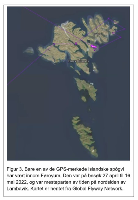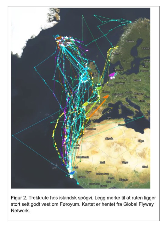 Av teimum á leið 20 vanligu spógvunum, sum eru merktir við GPSara seinastu 12 árini (mynd 2) hevur bert ein teirra steðgað á í Føroyum. Hetta var ein fuglur nevndur Acuno, sum var eygleiddur frá heystið 2019 til heystið 2024. Hann var í Føroyum frá 27. apríl til 16. mai 2022 (mynd 3). Áhugavert er, at tangspógvi og vanligur spógvi tykjast at hava øvugtan atburð, tá tað kemur til flyting, at tí at íslendski spógvin ferðast skjótari suðureftir á heysti enn norðureftir á vári.